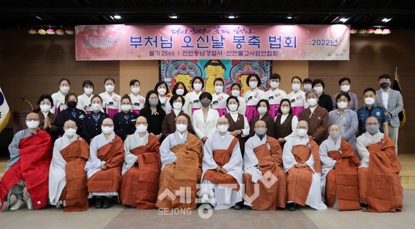 천안동남경찰서는 28일 경찰서 5층 대회의실에서 천안불교 사암연합회 및 경승 스님들과 경찰불자, 불교신도 등 100여명이 참석한 가운데 불기 2566년 부처님 오신날 봉축 법요식을 봉행하였다.