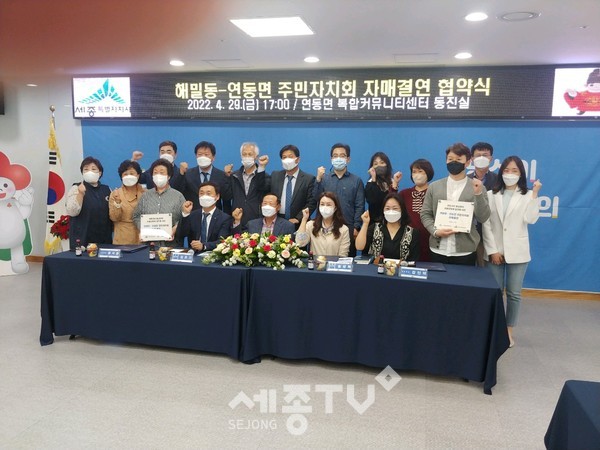 세종특별자치시 해밀동 주민자치회(회장 송상희)가 연동면 주민자치회(회장 김은기)와 지난 29일 연동면사무소에서 상호 간 교류 증진을 위한 협약식·간담회를 진행했다.