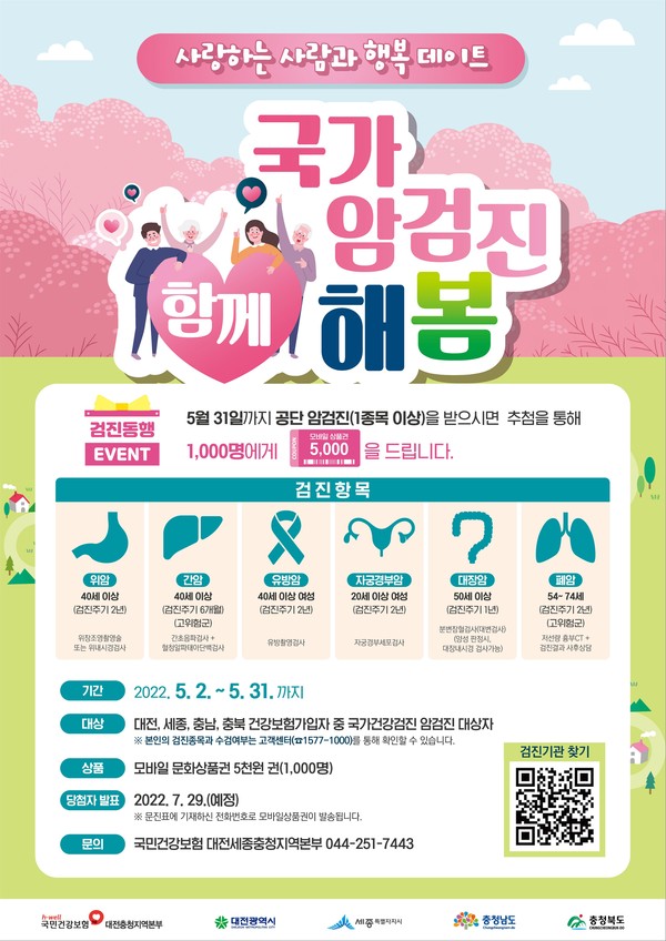 이번 5월은 가정의 달을 맞이하여 “사랑하는 사람과 행복 데이트, 국가암검진 함께 해~ 봄” 의 테마로 5월 2일부터 31일까지 대전, 세종, 충청지역 건강보험가입자를 대상으로 진행한다.