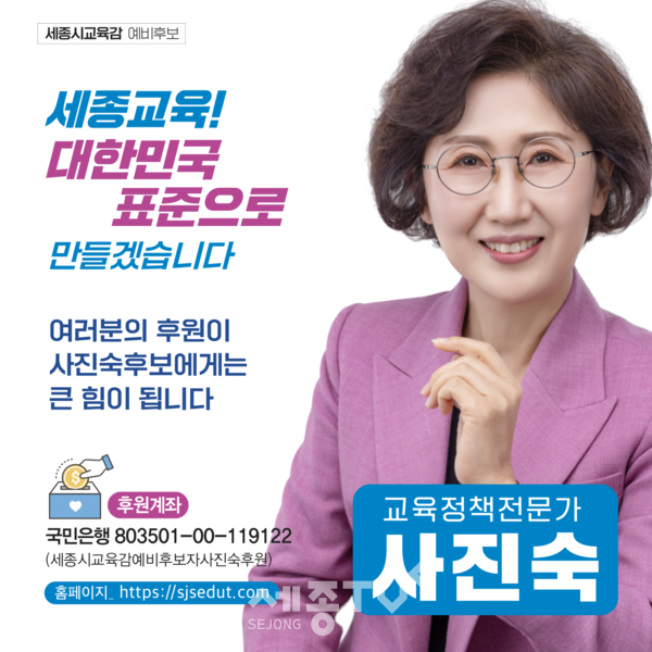 한편, 사진숙 후보는 “정권이 바뀌고 교육정책 또한 바뀌고 있다, 기존의 교육 패러다임으로는 세종교육을 대한민국 표준으로 만들어 낼 수 없다”며 “미래교육을 선도할 사진숙 후보에게 후원하면 아이들의 미래가 바뀐다”고 후원에 함께 해 줄 것을 당부했다.