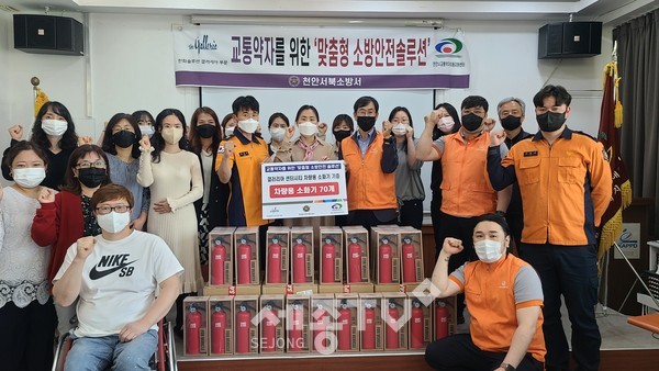 천안서북소방서는 천안시교통약자 지원센터와 협업하여 교통약자 이동지원차량 운전자의 책임감 향상을 위해 화재 초기 대응요령을 교육하였으며 한화솔루션 갤러리아 부문&한화에스테이트 운영지원센터의 사회환원사업으로 교통약자 이동지원차량에 소화기 80대를 후원하였다.