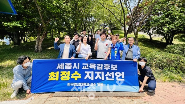 5월의 햇살이 가득한 세종시 장군면 대학길 한국영상대 교정에 20여명의 교수들이 모여 세종시 교육감에 나선 최정수 후보의 선거승리를 위한 지지선언을 했다.