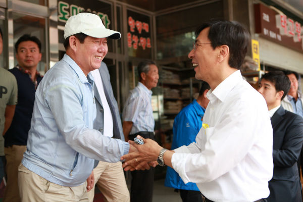 - ▲ 안희정 새정치민주연합 충남도지사 후보가 27일 금산군 약령시장 삼거리에서 지지를 호소하고 있다.(사진제공=안희정 선거 사무소)