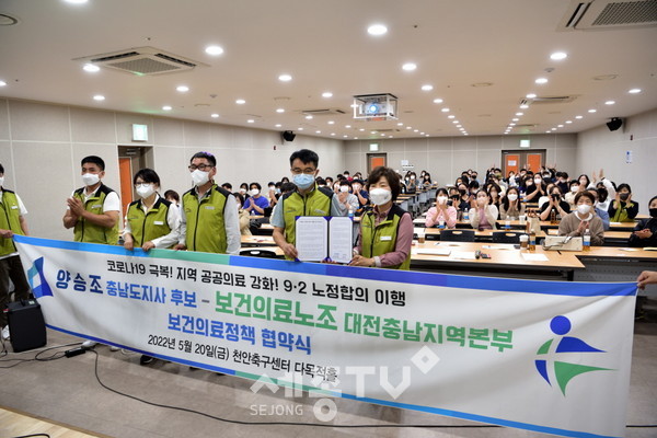 양승조 충남도지사 후보는 20일 전국보건의료산업노동조합 대전충남지역본부(이하 보건의료노조)와 ‘충남남도 공공의료 확충·강화를 위한 정책협약식’을 개최했다.