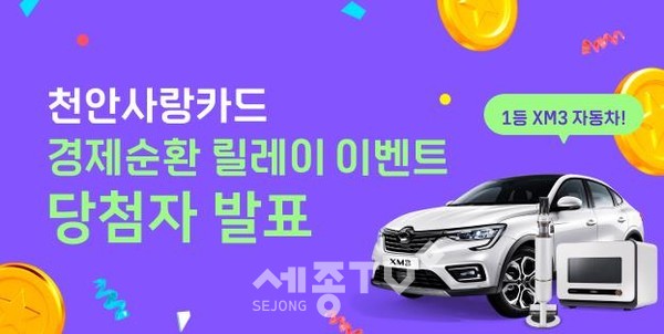 경품은 1등 르노 XM3 자동차(1명), 2등 청소기(1명), 3등 전자레인지(1명), 4등 3만원 천안사랑카드 포인트(250명), 5등 1만원 천안사랑카드 포인트(1,000명)이다.