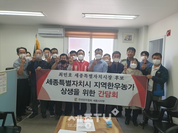 최민호 국민의 힘 세종시장 후보는 26일 세종시지부 사무실에서 오후 전국한우협회 세종시지부 회원 등 20여명이 참석한 가운데 세종시 지역한우농가 상생을 위한 간담회를 갖고 최 후보 지지를 선언했다.