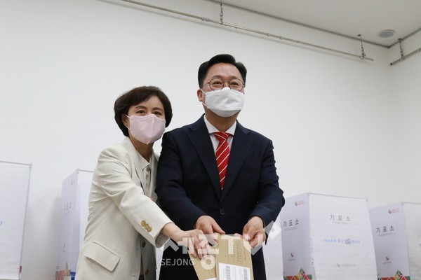 이장우 국민의힘 대전광역시장 후보는 27일 오전 부인 김세원 씨와 함께 대전시청 1층에 마련된 둔산1동 투표소를 찾아 제8회 전국동시지방선거 사전투표를 마쳤다.