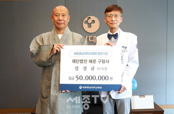 세종충남대학교병원(원장 신현대)은 재단법인 해운 구암사 강성규 이사장으로부터 발전기금 5000만원을 전달받았다고 6월 9일(목) 밝혔다.