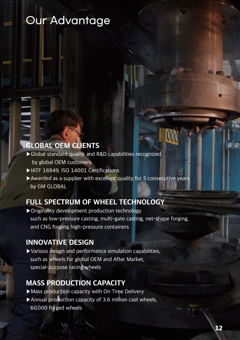 또한 글로벌 리더로 자리매김하기 위해 보다 아름답고 가볍고 내구성이 강한 최고급 단조휠의 개발과 생산 지속적으로 추진할 것이며 적극적인 R&D 투자와 신뢰성 확보를 통한 고객만족 달성에 끊임없이도전할 것이라고, 말했다.