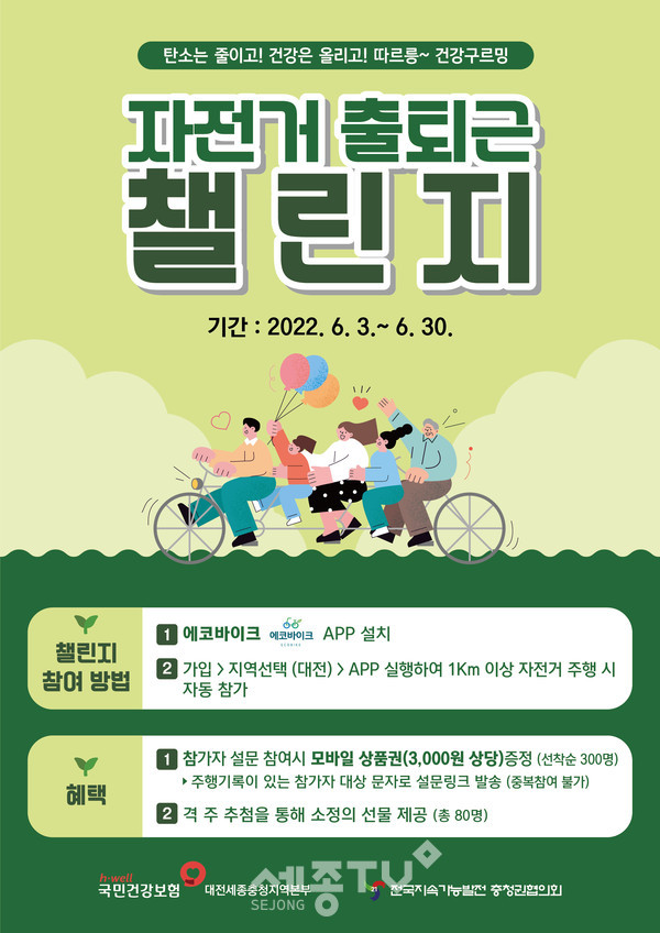 국민건강보험공단 대전세종충청지역본부(본부장 최옥용)는 단계적 일상 회복(Whith 코로나)으로 접어들며 코로나로 지친 지역주민의건강증진을 위해 지속가능발전 충청권협의회와 함께 ‘따르릉~ 건강구르밍 자전거 출퇴근 챌린지’를 실시한다고 밝혔다.