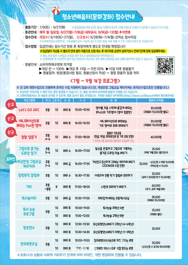 이번 청소년배움터는 청소년들의 건전한 여가와 취미활동의 기회를 제공하고자 영어, 컴퓨터, 드로잉, 캐리커쳐, 칼림바, 기타, 역사, 논술, 방송댄스, 창의로봇 등 11분야 14개 프로그램으로 구성돼 있으며 7월 9일~9월 27일 3개월간 진행된다. 2분기까지는 코로나19로 인해 부득이 대면수업과 비대면수업을 동시에 진행했으나, 이번 3분기부터는 위드오미크론 시대에 맞춰 전면 대면으로 운영하며 철저한 방역관리로 안전하게 프로그램에 참여할 수 있도록 준비하고 있다.