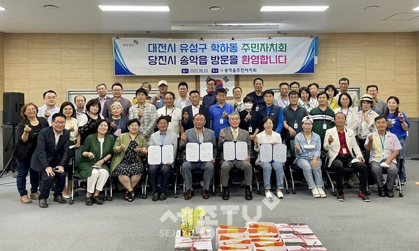 당진시 송악읍 주민자치회(회장 최창규)는 23일 송악읍행정복지센터 세미나실에서 대전 유성구 학하동 주민자치회(회장 양선동)와 자매결연 협약식을 가졌다.