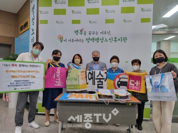 평택복지재단 산하 팽성노인복지관(관장 이원형)은 27일(월) 팽성읍 안정리에 위치한 평택시문화재단(대표이사 이상균) 산하 팽성예술인창작공간(팽성아트캠프)로부터 ’환경愛빠지다‘ 환경지킴봉사단의 환경정화활동을 위한 폐현수막 활용 ’쓰레기 수거가방‘을 전달받았다.