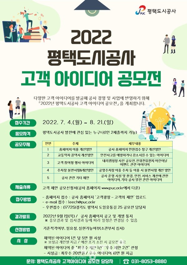 자세한 사항은 공사 홈페이지를 통해 확인 가능하며, 관련 문의는 평택도시공사 고객 제안 공모전 담당자(031-8053-8880)로 하면 된다.