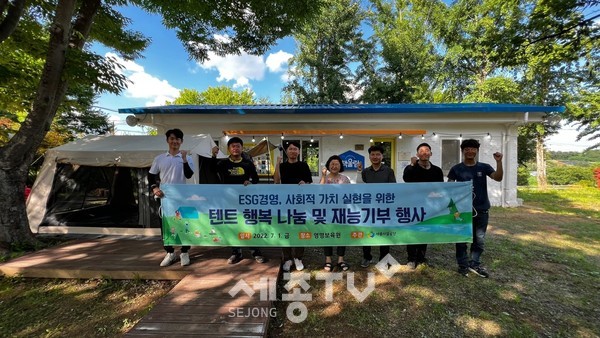 세종특별자치시시설관리공단(이사장 계용준, 이하 공단)은 1일 세종시 영명보육원에서 텐트 행복나눔 및 직원 재능기부 활동을 진행했다.