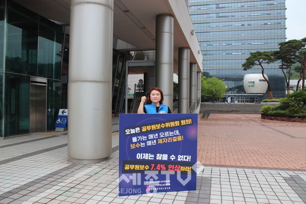 천안시청공무원노조(위원장 송영신, 이하 천공노)은 11일(월) 천안시청 일대에서 정부에 '23년도 공무원보수 7.4% 인상을 요구하는 1인 시위를 진행했다.