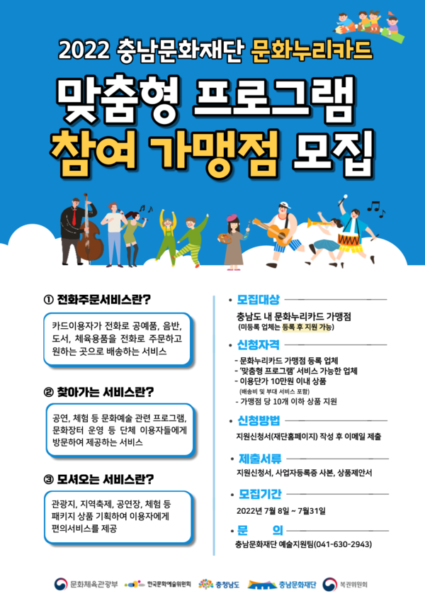 충남문화재단(대표이사 김현식)이 문화누리카드 사용이 어려운 이용자를 대상으로문화예술 향유 기회 확대를 위한 「맞춤형 프로그램」서비스 <전화주문, 찾아가는, 모셔오는> 참여 가맹점을 모집한다.