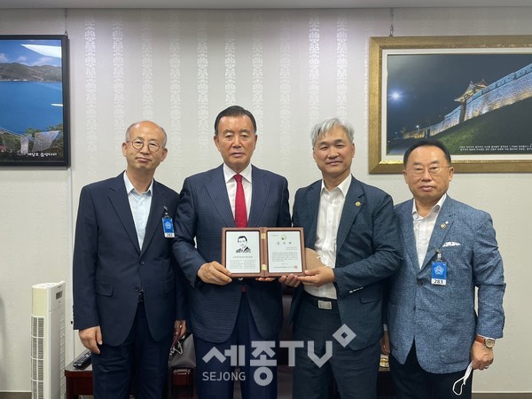 홍문표 국회의원(국민의힘, 충남 예산·홍성)이 13일 국회의원회관에서 지난해 11월 국회 본회의를 통과한 ‘임업직불제법’ 공로를 인정받아 (사)한국임업인총연합회(회장: 최무열)로부터 감사패를 수상했다.