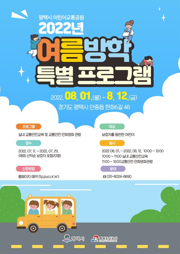평택시 어린이교통공원의 여름방학 특별 방학프로그램에 대한 자세한 사항은 홈페이지(tp.puc.or.kr)와 전화(031-8024-8690)로 문의하면 된다.