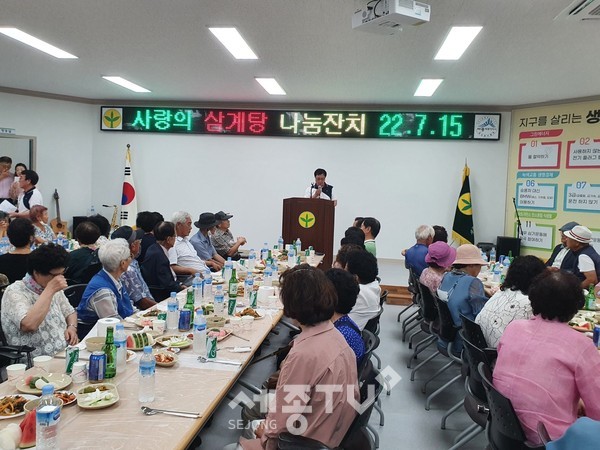 새마을지도자세종시협의회(회장 임한석)와 세종시새마을부녀회(회장 엄미숙)가 15일 관내 어르신 80명, 새마을가족 등 120여 명이 참석한 가운데 건강한 여름나기를 위한 “사랑의 삼계탕 나눔행사”를 개최했다.