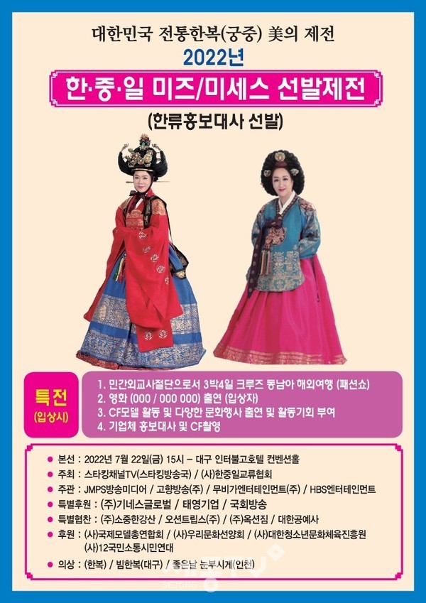 대한민국 전통한복 미의 제전인 ‘2022년 한중일 미즈/미세스 선발제전이 7월 22일 오후 3시 대구인터불고호텔 컨벤션홀에서 펼쳤다.