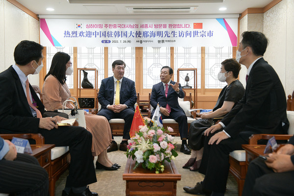 최민호 세종특별자치시장이 28일 시청 접견실에서 싱하이밍(邢海明) 주한 중국대사의 예방을 받고 한중 지방정부 간 우호증진과 협력강화 방안을 논의했다.싱 대사는 이번이 두 번째 방문으로써, 지난 2020년에도 코로나19 위기로 양국 지방정부 간 협력 지원을 위해 세종시를 방문한 적이 있다.