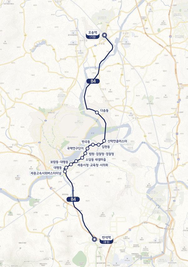 신규 운행되는 B4노선은 ▲반석역∼세종터미널∼대평동∼국책연구단지∼반곡동∼다솜동을 거쳐 오송역까지 운행되며,▲평일 5시 33분에서 23시 13분까지 ▲평균배차간격 40분으로 1일 27회 운행,주말운행도 동일하다.