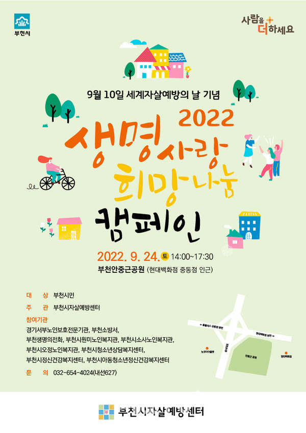 올해로 19회를 맞은 세계 자살예방의 날(9월 10일)을 기념하여 부천시보건소와 부천시자살예방센터는 오는 9월 24일 오후 2시부터 부천 안중근공원에서 ‘2022 생명사랑 희망나눔 캠페인’을 진행한다.