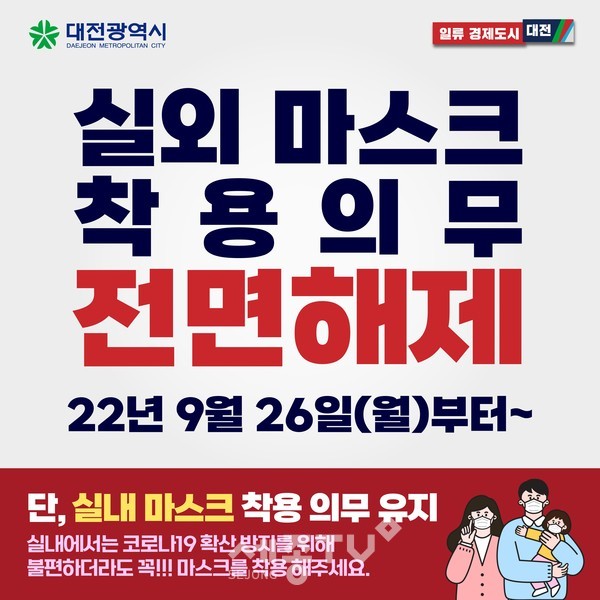 대전시가 오는 26일부터 실외 마스크 착용 의무를 전면 해제하고, 실외 공연 및 실외 스포츠 경기를 마스크 착용 없이 관람할 수 있다고 밝혔다.