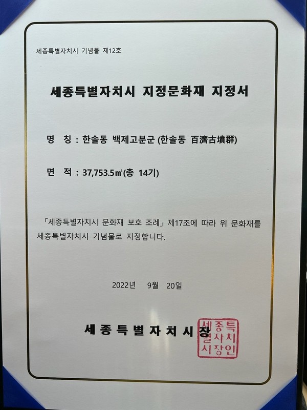 -한솔동 백제고분군 세종시 지정문화재로 지정-