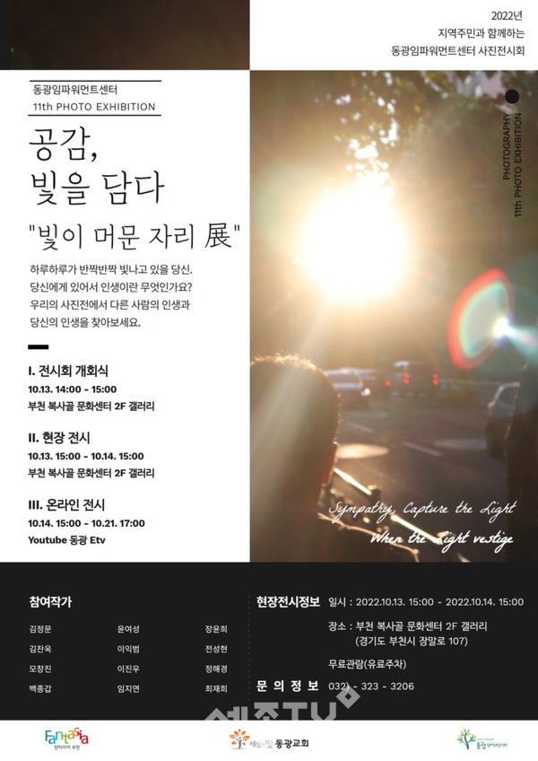 부천시(시장 조용익)와 부천시 보건소가 지원하는 정신재활시설 동광임파워먼트센터는 오는 2022년 10월 13일부터 14일까지 이틀간 부천복사골문화센터에서 제11회 사진전시회 ‘빛이 머문 자리 展 ’을 개최한다.