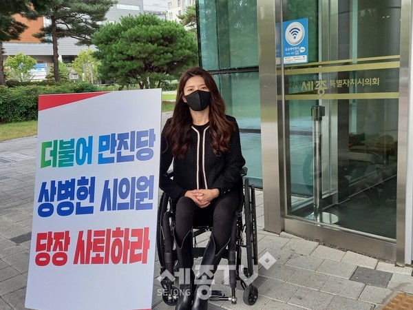 5일 1인 시위에는 세종시의회 이소희 의원이 상병헌 세종시의회 의장 사퇴를 촉구하고 나섰다.