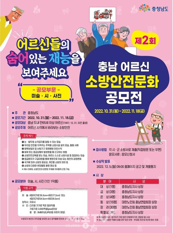 천안서북소방서(서장 김오식)는 어르신들의 안전의식 제고 및 안전분야 참여 유도를 위한 ‘제2회 충남 어르신 소방안전문화 공모전’ 참가자를 모집한다고 전했다.