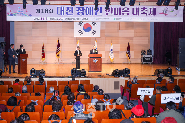 이장우 대전시장은 24일 제18회 대전장애인한마음대축제를 찾아 장애인복지발전에 기여한 유공자에게 표창을 수여하고, 행사를 준비한 (사)대전시지체장애인협회 관계자들을 격려했다.