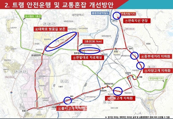 이와 함께 트램의 운행안전성 향상 및 도심 교통난 해소를 위해 일부 구간 지하화(3.6km) 및 한밭대로 차로 확장도 병행 추진된다.