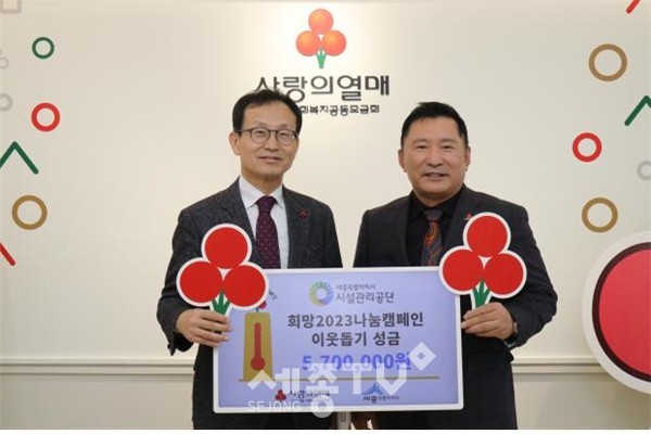 세종특별자치시시설관리공단(이사장 계용준, 이하 공단)은 지난 17일 연말연시 소외된 이웃을 돕기 위한‘희망2023나눔 캠페인’에 동참하여 성금 570만원을 세종사회복지공동모금회에 전달했다.