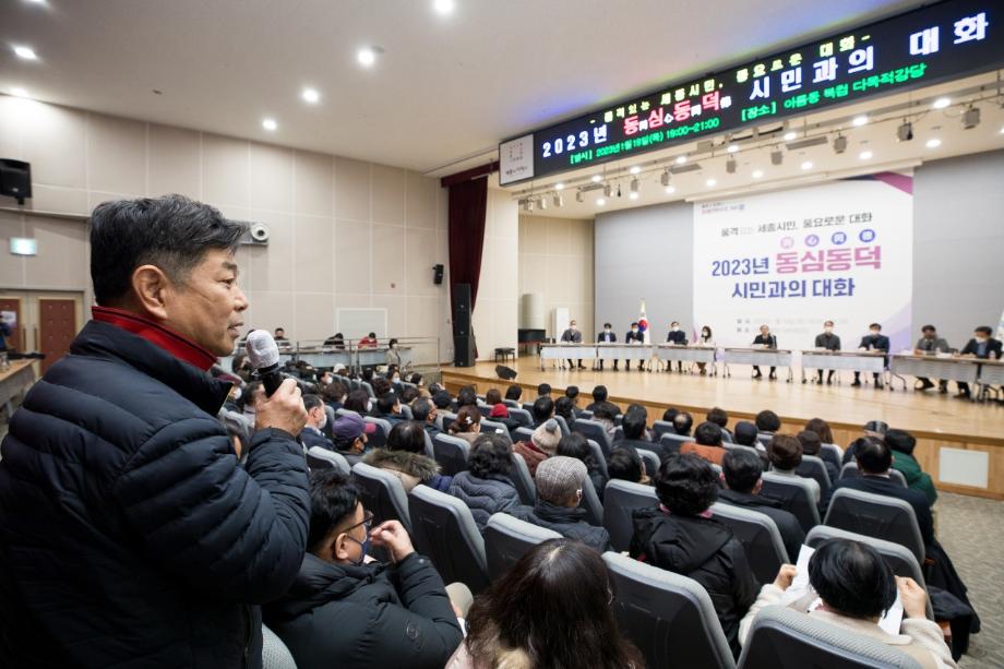 세종특별자치시는 지난 19일 아름동 복합커뮤니티센터에서 ‘2023년 동심동덕 2차 시민과의 대화’를 열고 아름·한솔·도담·종촌·고운·새롬·다정·해밀동 시민들과 대화를 나눴다.