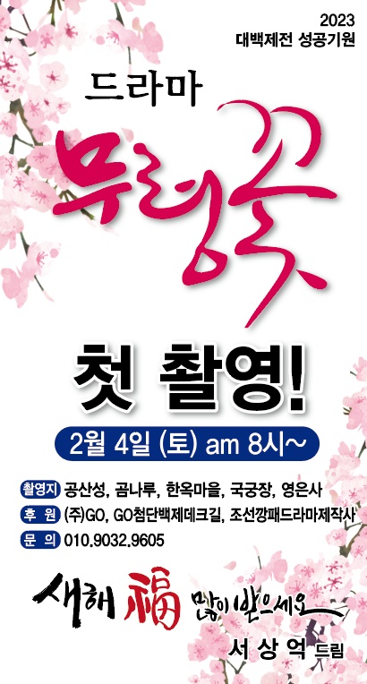 ‘무령꽃’ 작품을 기획한 가수 서상억씨는 “금강의 역사를 새롭게 써내려 가는 자만이 백제사의 새로운 지평을 열 것”이라며 “백제 도읍 웅진을 배경으로 한 무령꽃‘ 드라마는 백제배경 첨단 판타지로 공주의 새로운 신드롬을 불러 일으켜 2023대백제전의 성공을 이끌 것으로 확신한다”고 말했다.