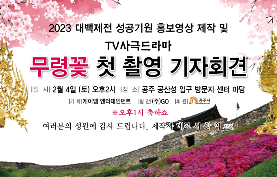 2023대백제전 성공기원 홍보영상 제작 및 드라마 ‘무령꽃' 첫촬영 기자회견 및 축하쇼가 2월 4일 토요일 오후 1시 공주시 공산성 입구 방문자센터 마당에서 진행된다.