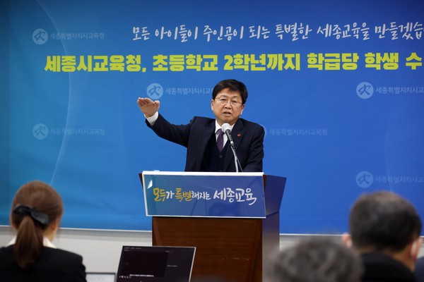 세종시 교육청 최교진 교육감은 27일 10시 교육청 대회의실에서 국가 목표인 국토 균형발전과 수도권 과밀화 해소를 목적으로 설계된 행복도시에 걸맞은 미래교육환경으로 학생과 교사가 서로 더욱더 가까워질 수 있는 기본적인 교육환경 조성을 위해 학교의 시설 여건, 학생 수 변동 추이, 교사 정원 현황 등을 종합적으로 고려해 ◀올해부터는 전국 최초로 초등학교 2학년까지 학급당 학생 수 20명 배치를 확대한다고 밝혔다.