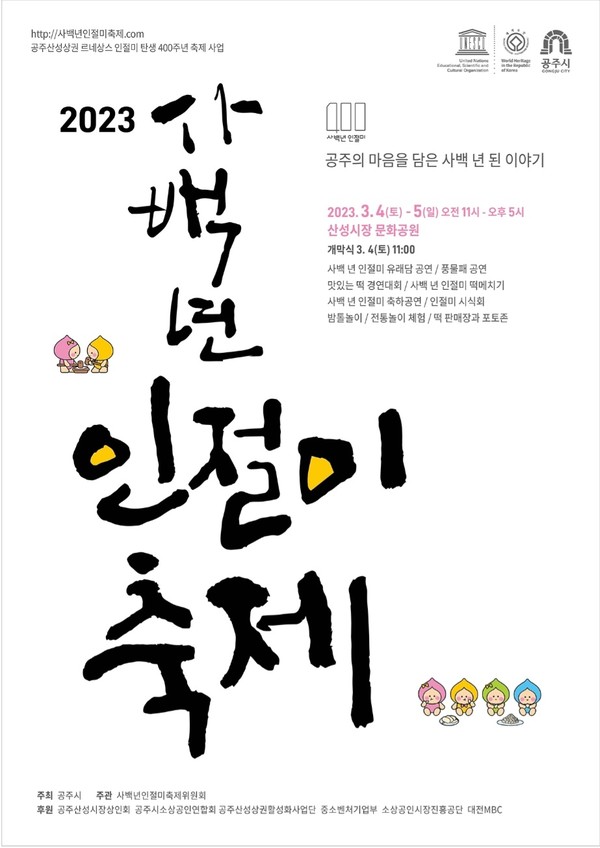 -3.4.(토)~3.5(일) 오전11:00~오후5:00 산성시장 문화공원- Tag ##사백년인절미축제#공주 저작권자 © SJB세종TV 무단전재 및 재배포 금지 이유진 기자 다른기사 보기 페이스북 트위터 카카오톡 네이버블로그 구글+ URL복사 기사공유하기