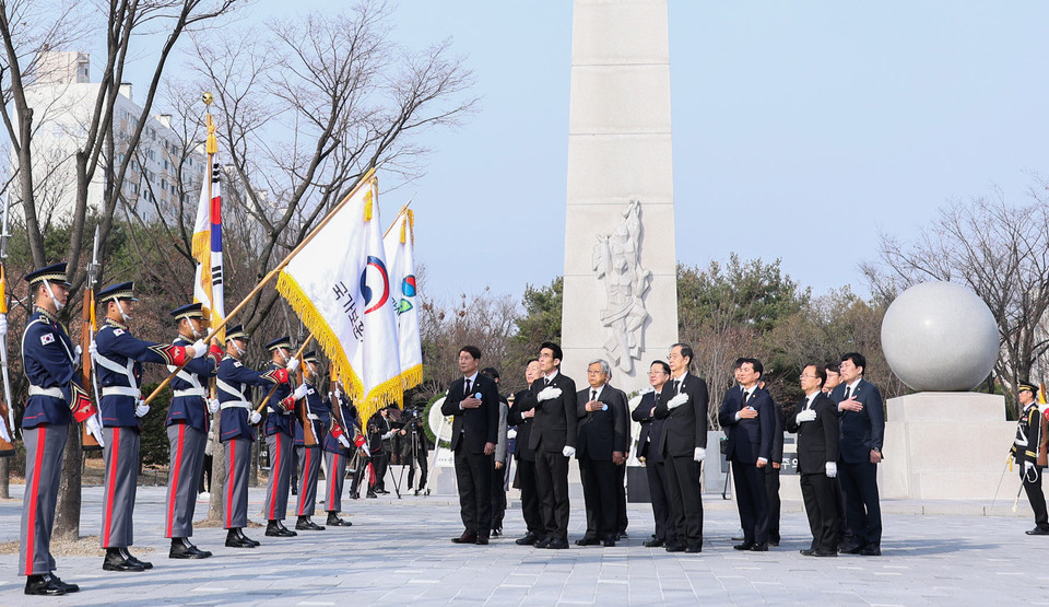 기념식에 앞서 3·8민주의거 주역, 한덕수 국무총리, 이장우 대전시장, 3·8기념사업회장, 국가보훈처장 등 17명은 둔지미공원 3․8민주의거 기념탑을 찾아 참배했다.