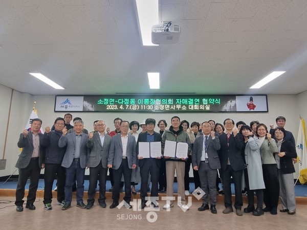 세종특별자치시 소정면 이장협의회(회장 이병두)가 다정동 통장협의회(회장 김성호)와 7일 소정면행정복지센터에서 공동발전을 위한 자매결연을 맺었다.