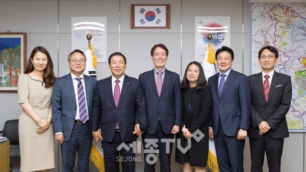 최민호 세종특별자치시장은 14일 집무실에서 유민봉 시도지사협의회 사무총장을 만나 39만 세종시민을 대신해 사무소 설치에 대한 환영의 뜻을 전달했다.