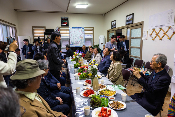 최민호 시장이 금암2리 마을회관에 들어서자 뜨거운 악수로 주민들의 환대를 받으며 자리에 앉자마자 그동안 쌓아두었던 마을에 대한 건의와 질문에 쉴새 없이 답하며 경청했다.