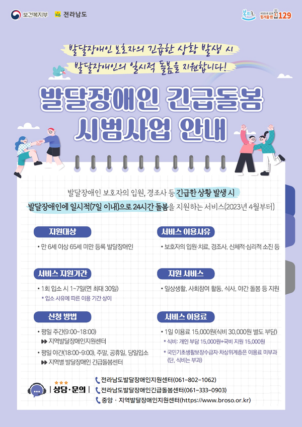 이상심 전남도 보건복지국장은 “발달장애인 보호자에게 입원 등 긴급한 상황이 발생하면 발달장애 자녀를 안심하고 맡길 데가 부족했다”며 “1만 4천여 발달장애인과 가정의 돌봄 부담 경감을 위해 권역별 긴급 일시돌봄센터를 신속히 마련하겠다”고 말했다.