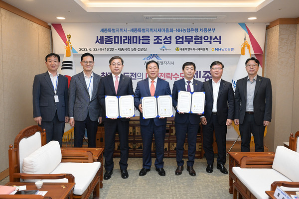 세종특별자치시(시장 최민호)는 22일 시청 5층 접견실에서 마을의 정주환경을 개선하고 공동체 활성화를 위해 세종시를 비롯한 세종시새마을회, 엔에이치(NH)농협은행 세종본부 기관 3곳이 모여 ‘세종미래마을 조성 업무협약’을 체결했다.