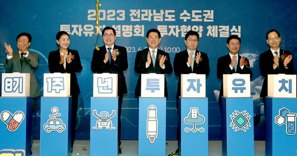 전라남도는 28일 웨스틴조선서울호텔에서 첨단·전략산업 투자유치를 위한 ‘수도권 투자유치 설명회’를 열고 ㈜한화 글로벌부문 등 5개 기업과 2조 5천억 원 규모 투자협약을 했다.