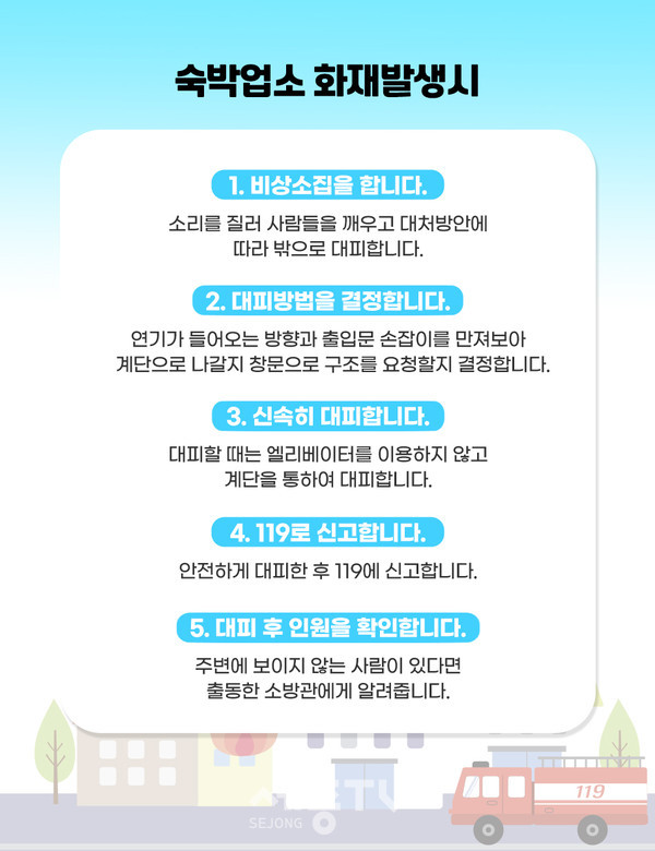 소방서 관계자는 “숙박시설은 다수의 인원이 이용하는 만큼 인명피해 우려가 크다”라며 “안전하고 즐거운 휴가를 보낼 수 있도록 화재 및 안전사고 예방·대응에 최선을 다하겠다”고 말했다.