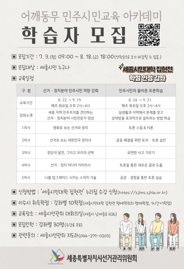 세종특별자치시선거관리위원회(이하 ‘세종시선관위’)는 8월 18일까지 세종시민 대상 ‘어깨동무 민주시민교육 아카데미’수강생을 선착순 모집한다.